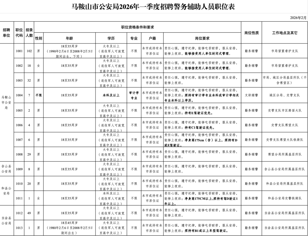 1.学历、年龄条件:详情见《马鞍山市公安局2026年一季度招聘警务辅助人员职位表》(附件1)