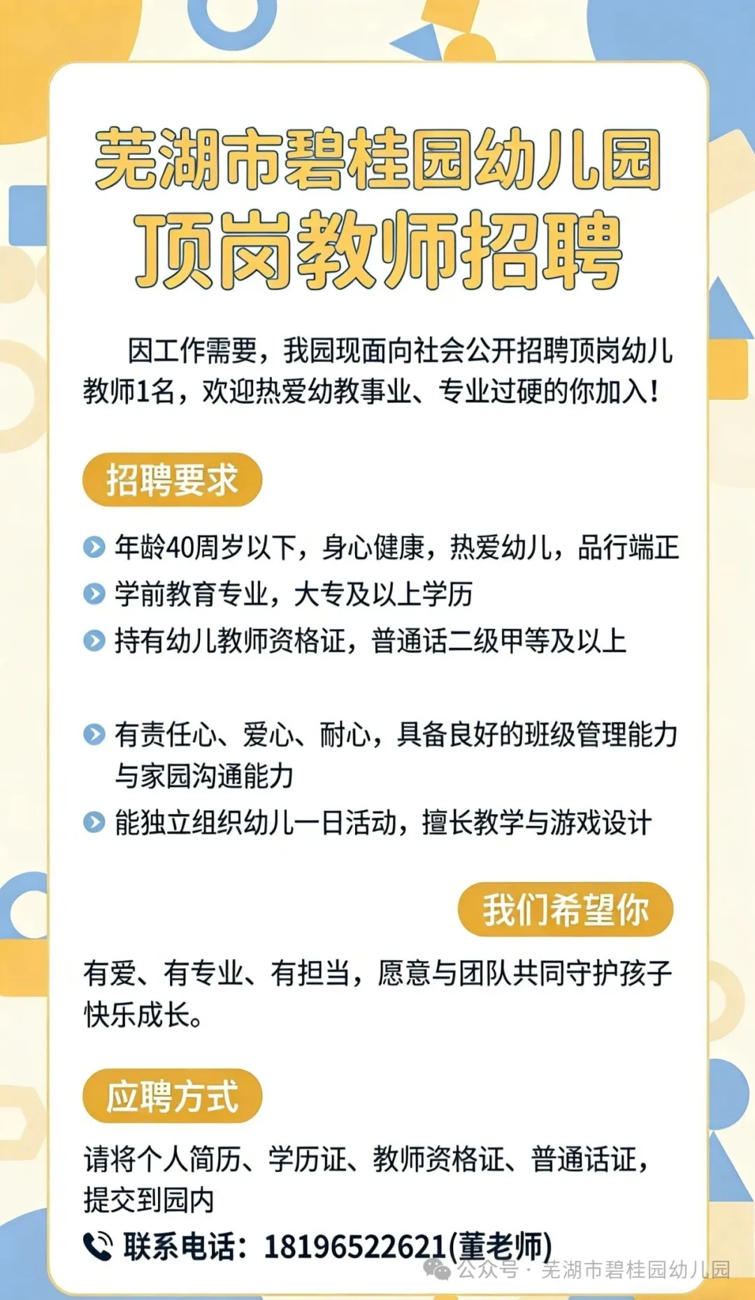 2026年芜湖市碧桂园幼儿园顶岗教师招聘公告