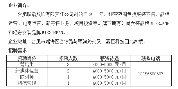 合肥联晟服饰有限责任公司招聘